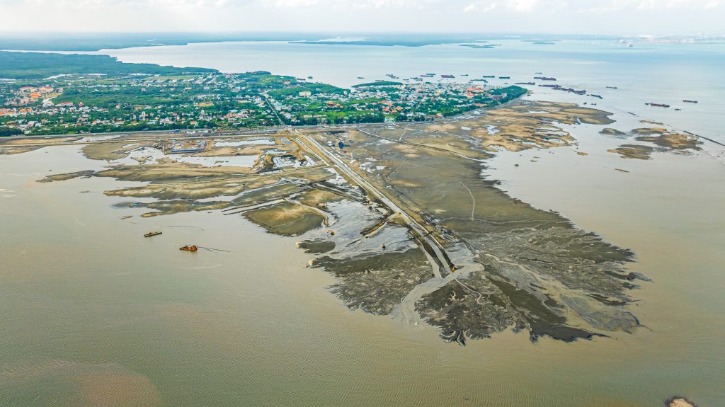 Thực tế dù mới khởi công 5 tháng, hàng trăm máy xúc, xà lan đã tiến hành san lấp, bơm cát và gia cố móng, dần hình thành mặt bằng cho các hạng mục chính.